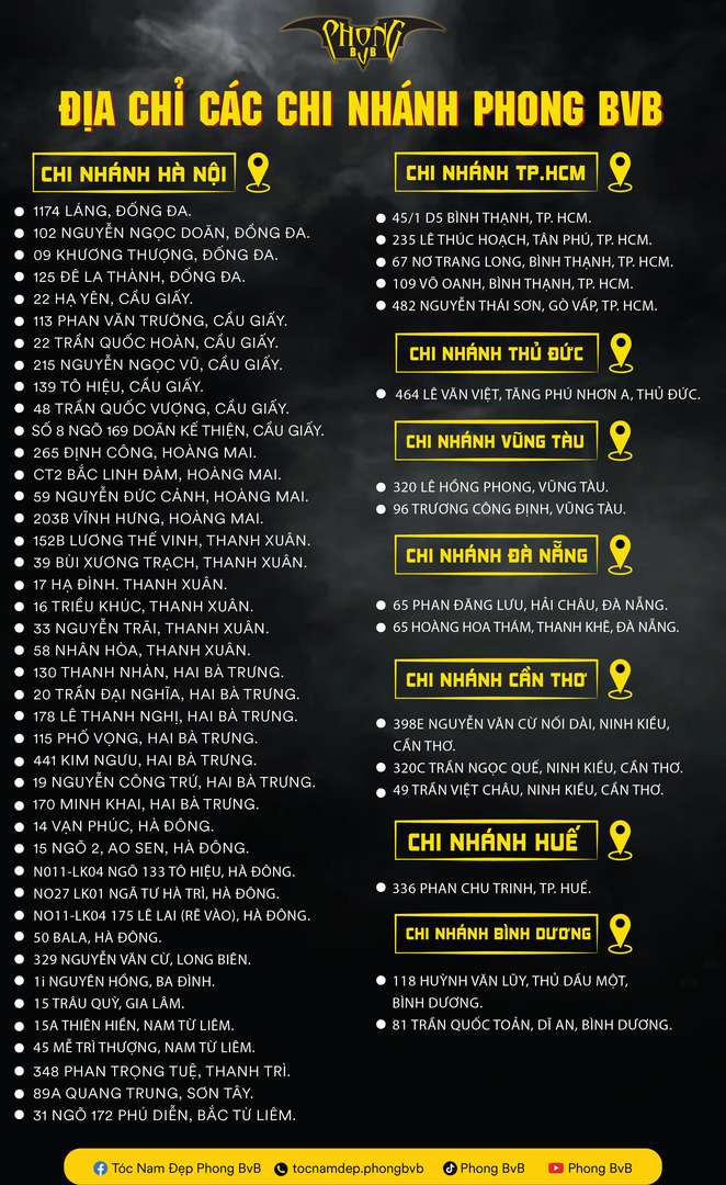 Trên đây là danh sách các cơ sở của Phong BVB trên toàn quốc. Hy vọng Phong BVB sớm được phục vụ bạn. Hãy nhắn tin cho fanpage Tóc Nam Đẹp Phong BVB nếu muốn được hỗ trợ thêm.