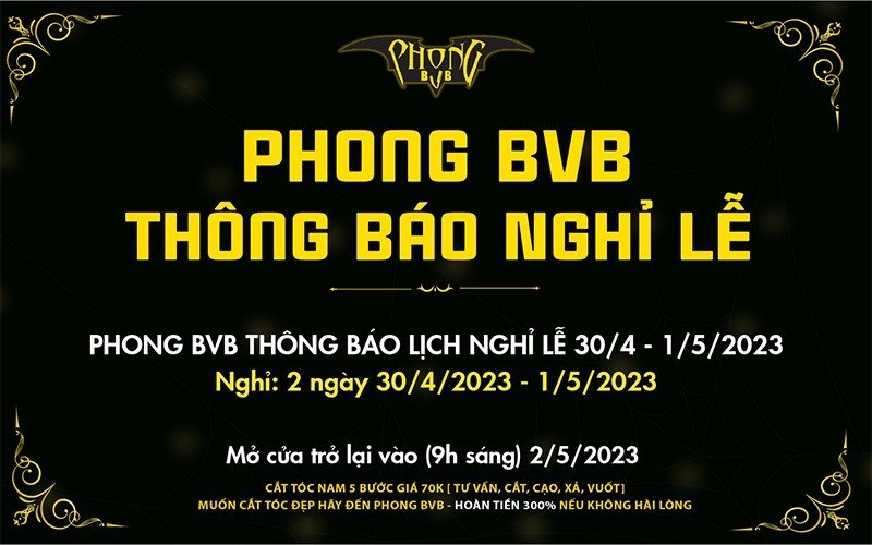 Toàn bộ hệ thống Phong BVB nghỉ lễ 2 ngày: 30/04 và 01/05/2023. Chính vì thế, anh em hãy qua cắt tóc sớm trước ngày 26 để đỡ phải chờ đợi mệt mỏi. Tầm 27,28,29/04 khách hàng thường sẽ tới cắt tóc rất đông đấy!