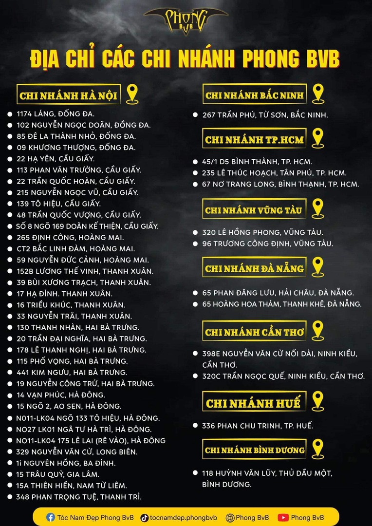 - Dưới đây là tổng hợp địa chỉ các cơ sở của Phong BvB trên cả nước. Anh em gần cơ sở nào? Qua triển ngay một quả đầu mới nhé!