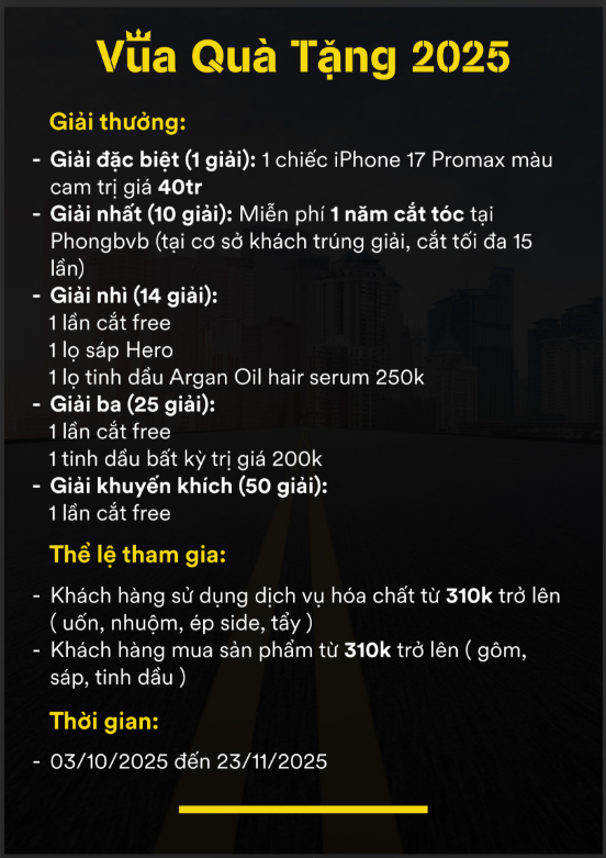 Anh em đừng quên chương trình Vua quà tặng Phong BvB 2025 vẫn đang diễn ra và dần đi đến giai đoạn cuối cùng. Chỉ còn 1 tuần nữa, CT sẽ kết thúc, ae nhanh tay đăng ký tham gia thử vận may với những món quà cực kỹ hấp dẫn. AE chỉ cần sử dụng dịch vụ hóa chất hoặc mua sản phẩm với hóa đơn từ 310k là đã đủ điều kiện bốc thăm và phần thưởng lớn nhất chính là 1 chiếc IPHONE 17 PROMAX màu cam vũ trụ.